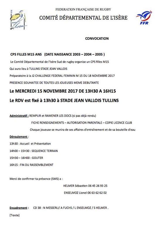 Pour les M15 féminines, voici une convocation pour ce Mercredi 15 Novembre à Tullins.