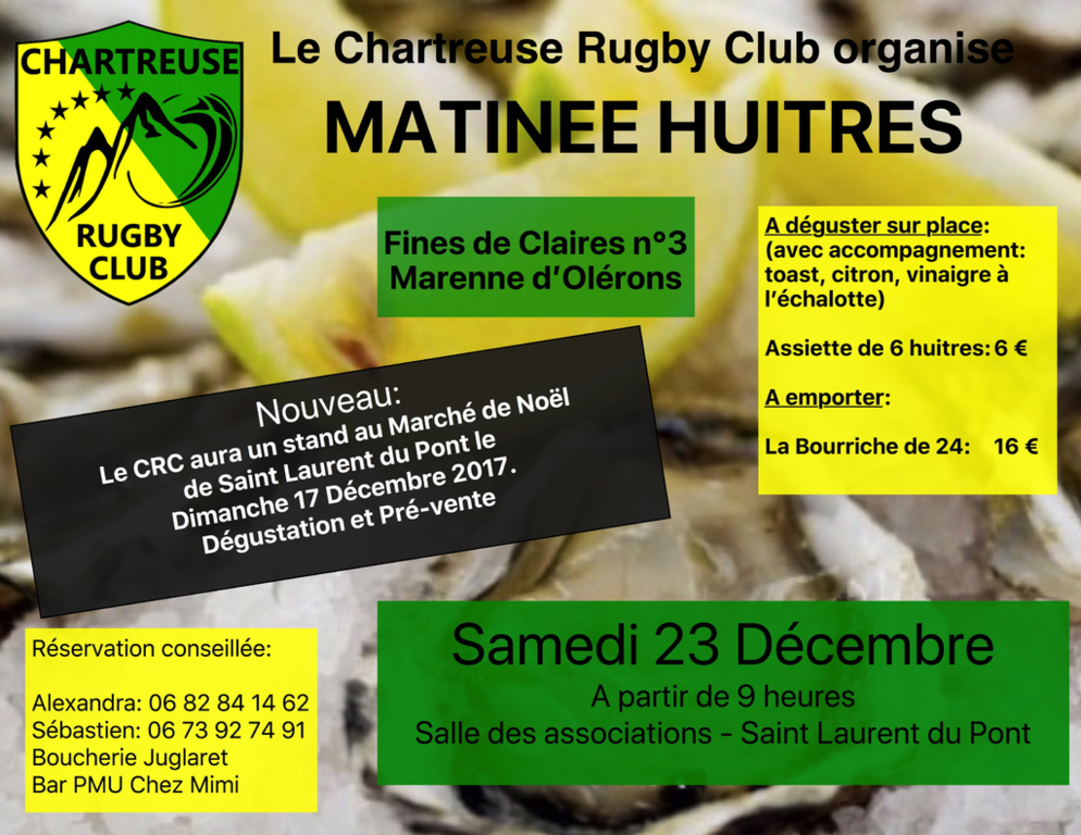 Comme chaque année, le CRC fera sa matinée huîtres le Samedi 23 Décembre à la salle des associations à Saint Laurent du Pont.