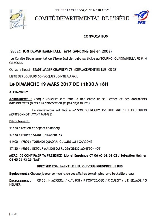 La Sélection M14 Isère garçon joue à Chambéry ce Dimanche 19 Mars. Un de nos joueur M14 participe à ce tournoi quadrangulaire. Infos sur convocation ci-jointe.