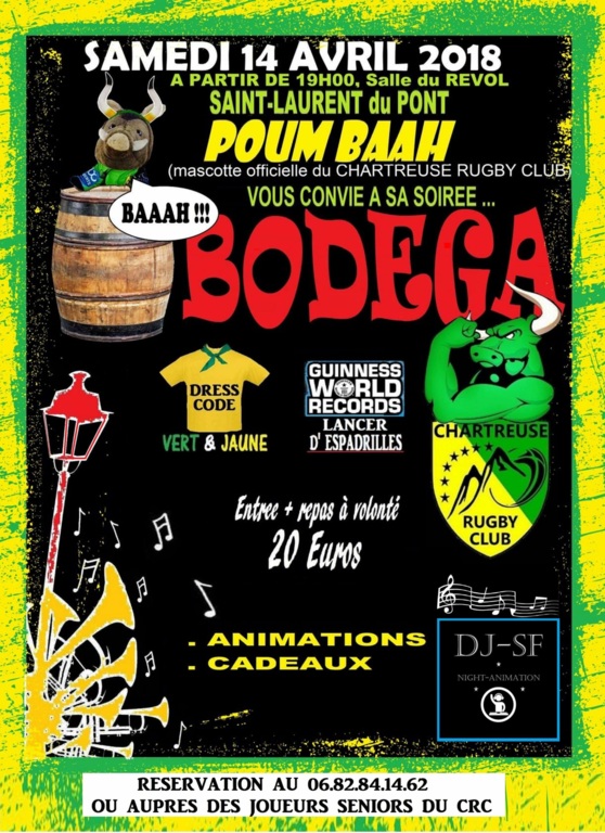 Réservez vite votre soirée du 14 Avril pour la 3 ème édition de notre soirée BODEGA !!!!! Réservation auprès des joueurs.